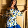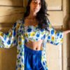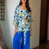 3 piece co ord set. Satin silk broad pants are paired with pansy print bustier and cover up.