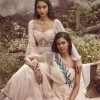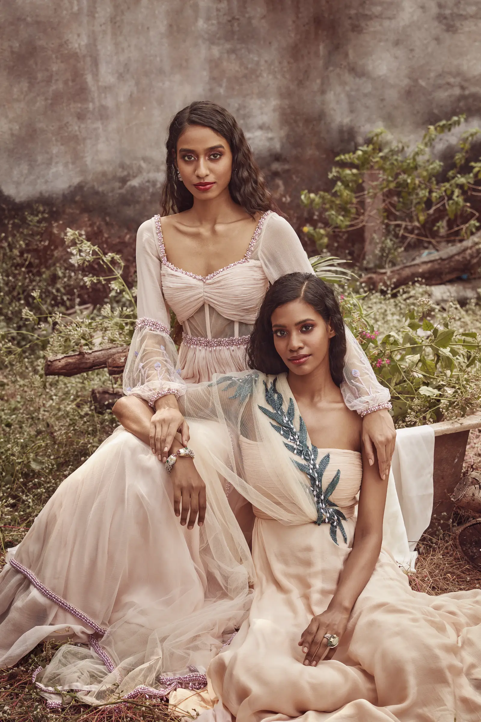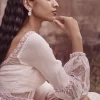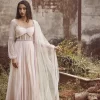 Blush Chiffon corset style Anarkali paired with pants, delicately embroidered with glass beads and pearls.
