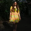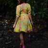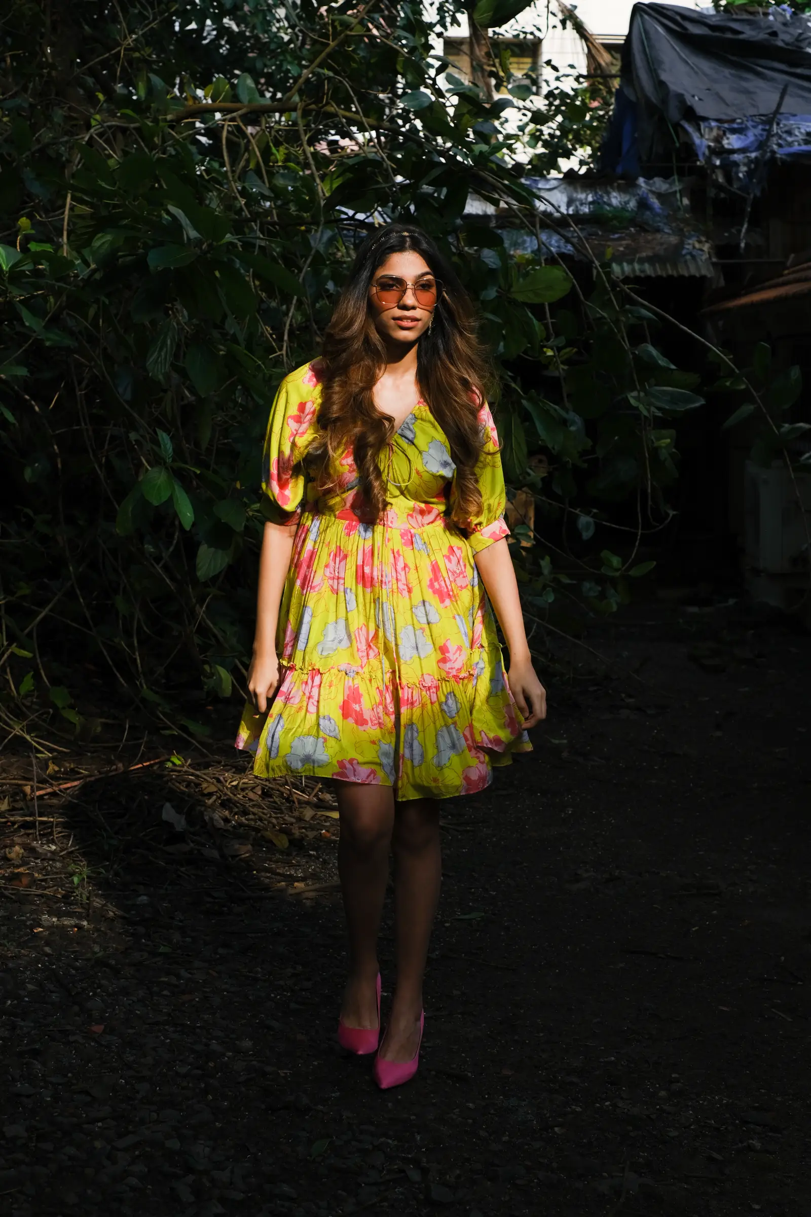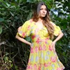 Short tiered dress in silk with oversized sleeves and drawstrings on neckline