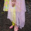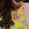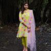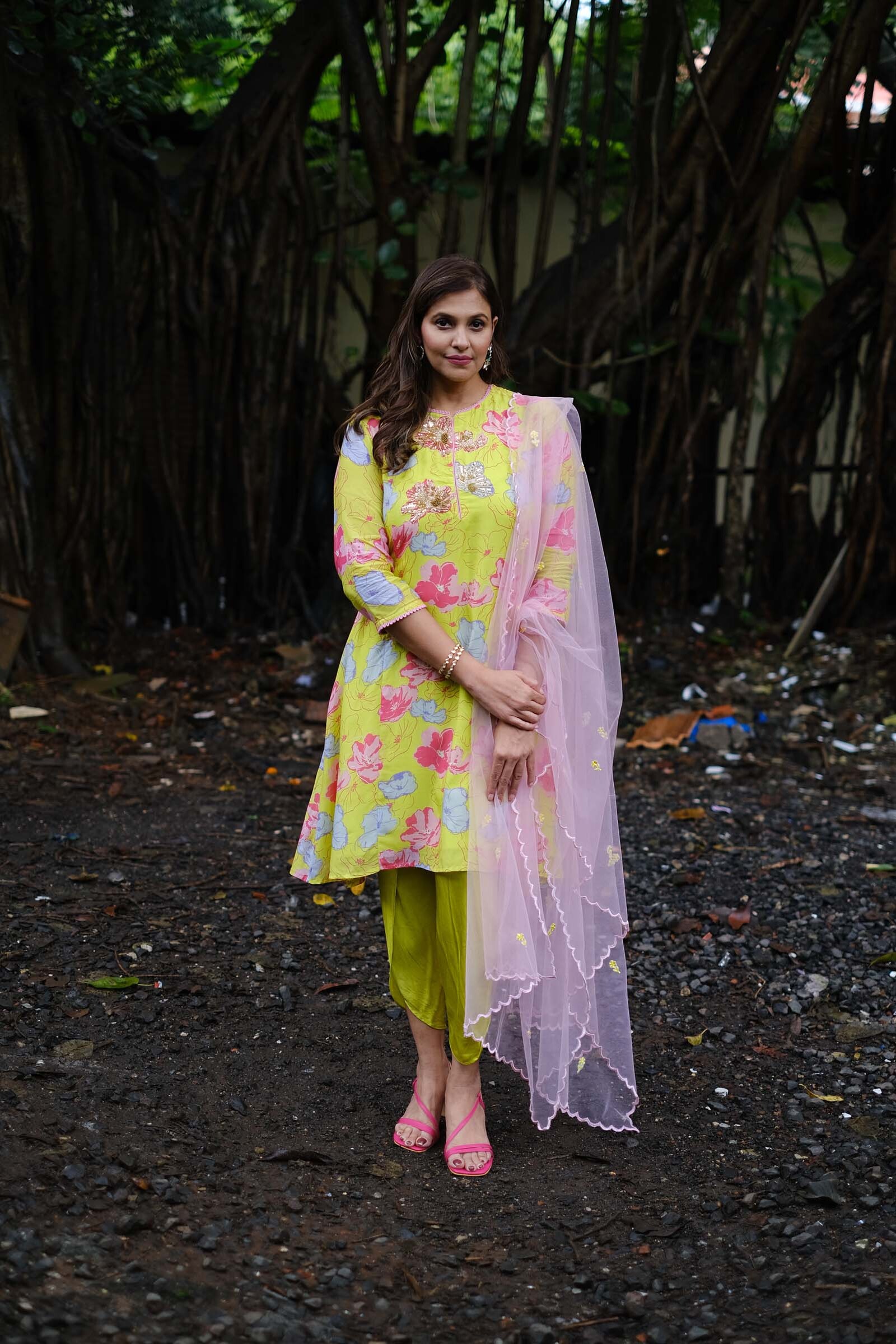 Printed Kalidaar kurta in cotton silk with dhoti pants paired with embroidered tulle dupatta and embellishments on neckline.
