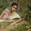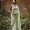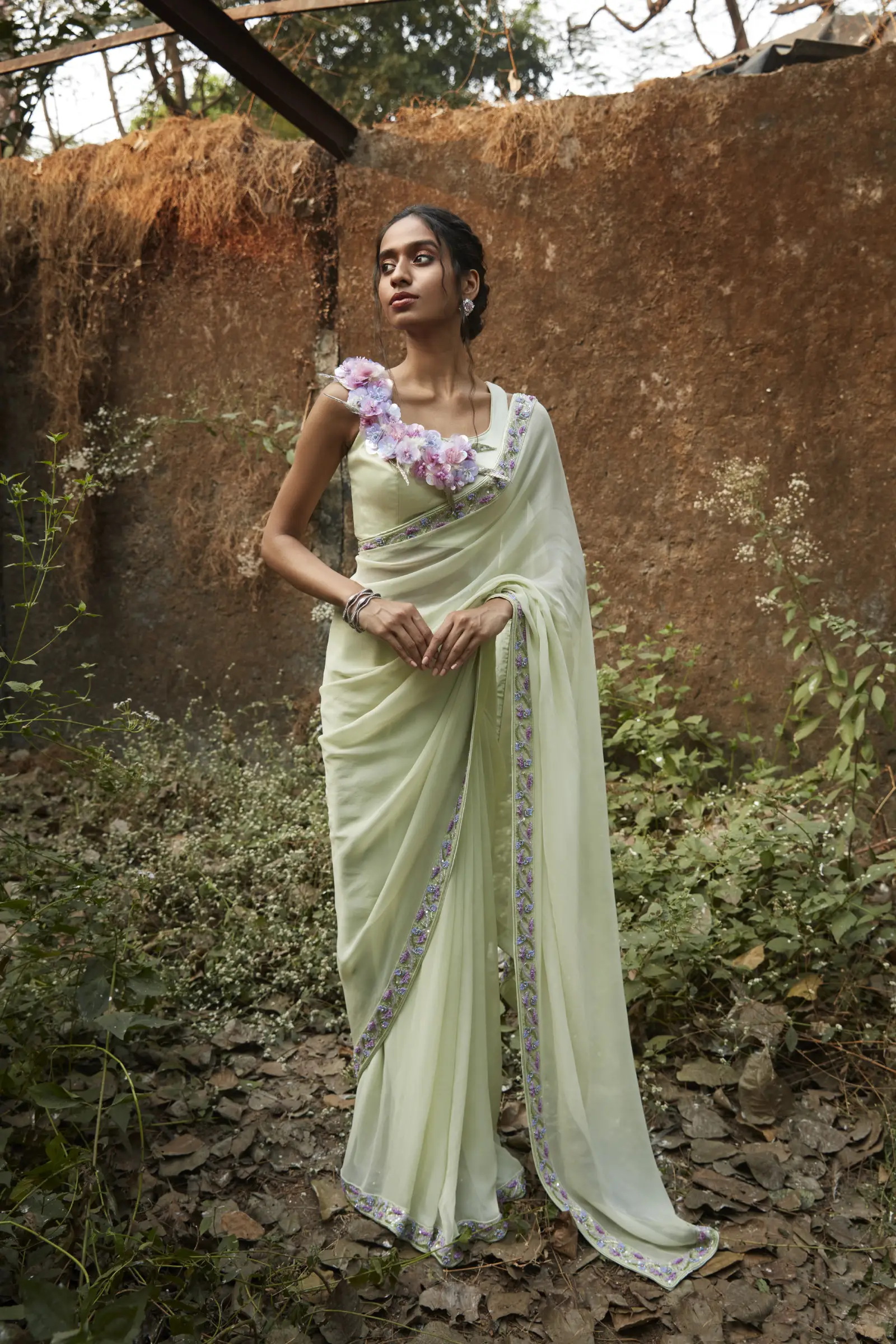 Mint georgette blouse embellished with bouquet of 3D flowers and leaves. Saree is delicately embroidered with glass beads and sequins.