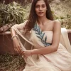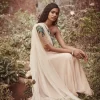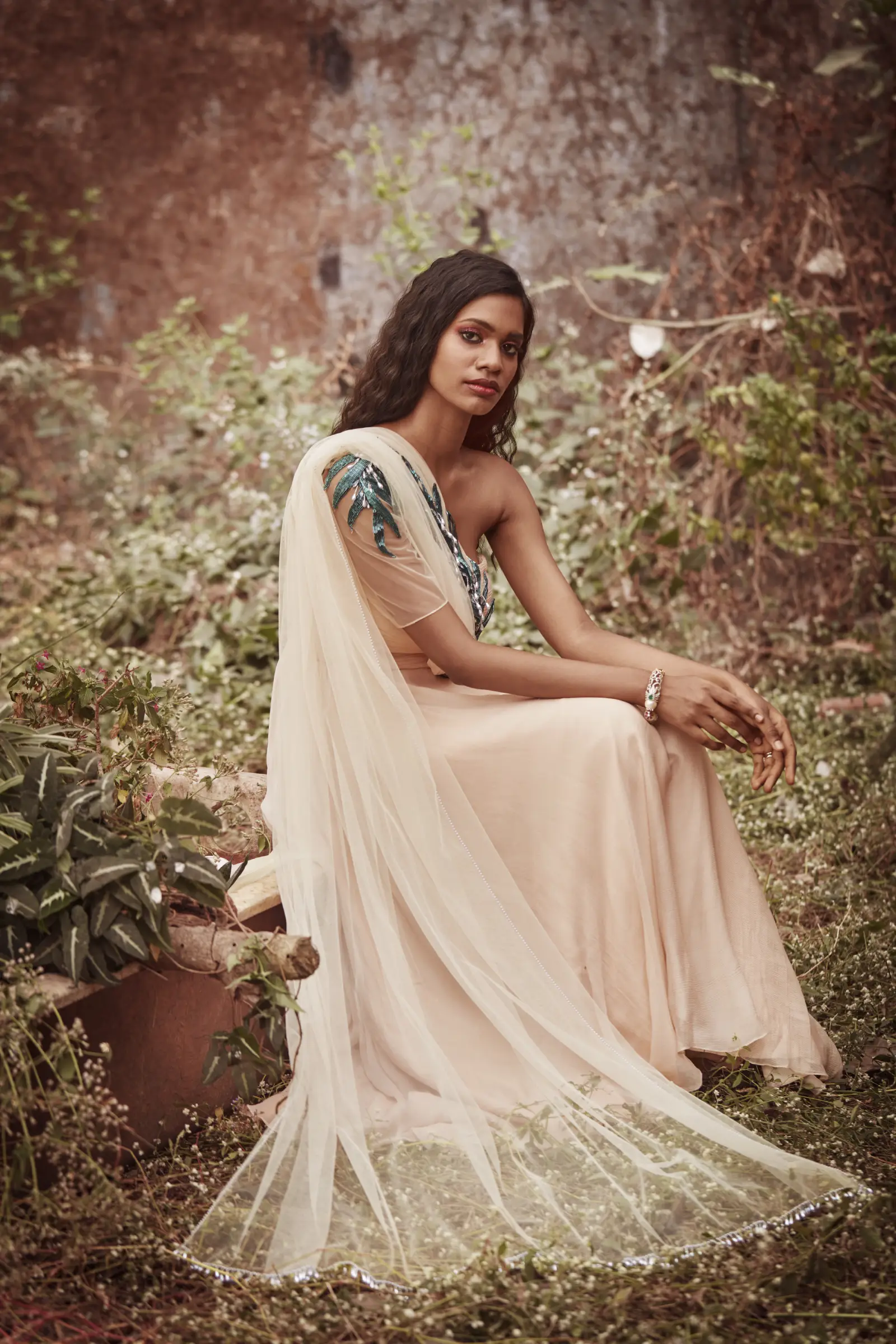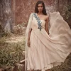 Peach chiffon off shoulder kurta with attached tulle dupatta detailed with pearls, paired with pencil pants. Kurta is embellished with cut dana 3D leaves and pearl drops.