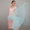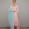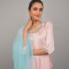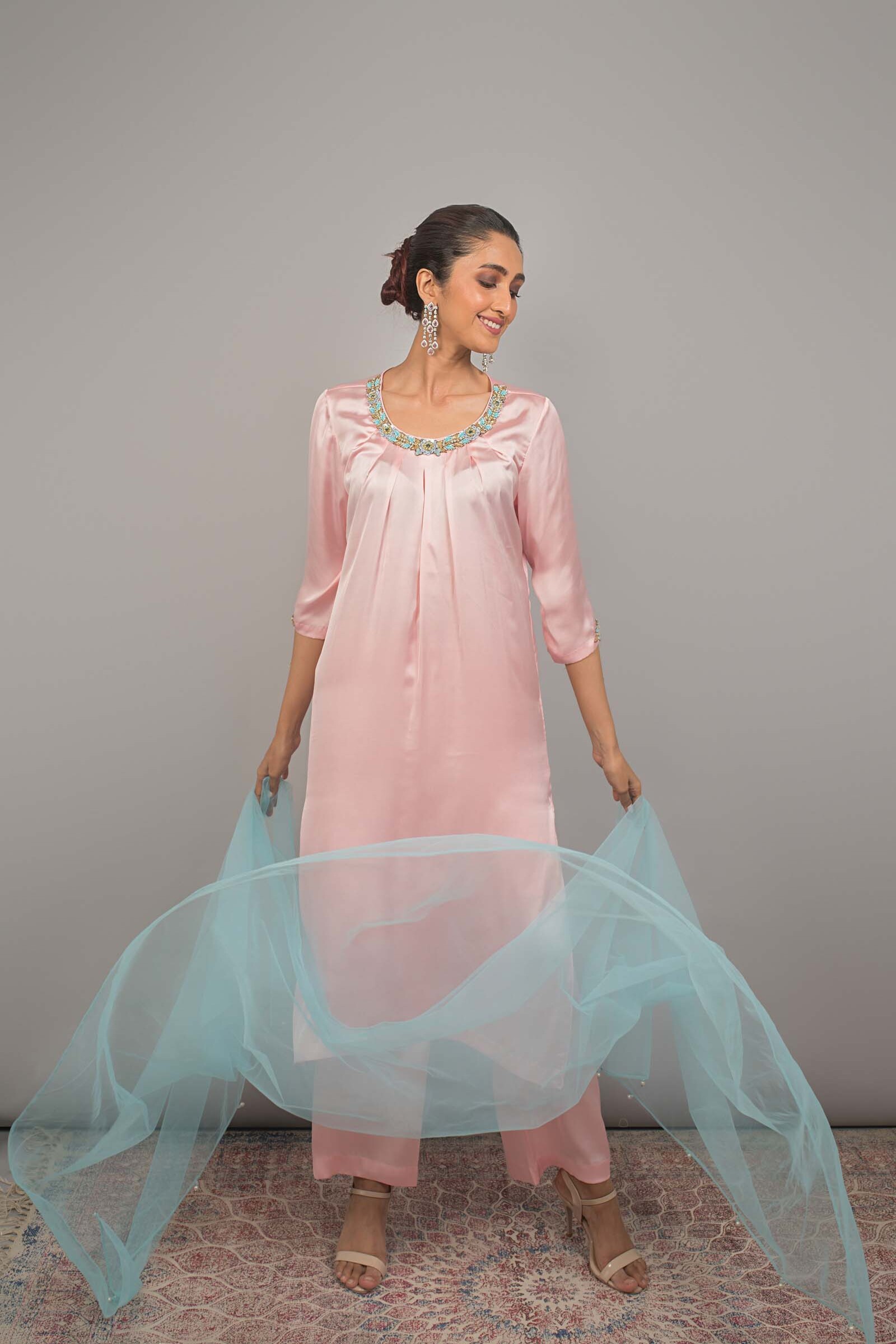 Peach kurta set in satin with embroidery is paired with tulle dupatta in firozee.