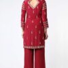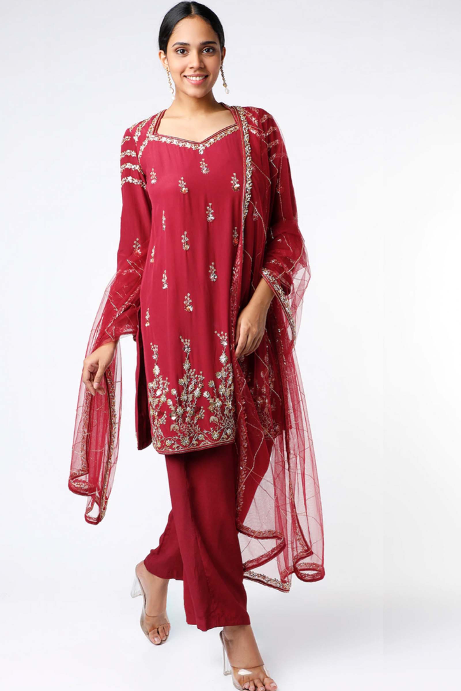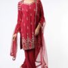 Featuring Wine kurta set in crepe silk base with mukaish embroidery. It is paired with matching broad pants and tulle dupatta.