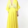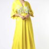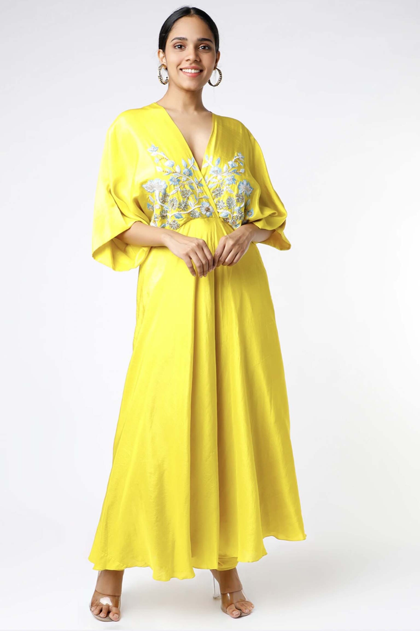 Featuring a yellow Kimono style anarkali in dupion silk base highlighted with resham, sequins, zardozi and crystal embroidery. It is paired with matching chudidaar pant in lycra net base.